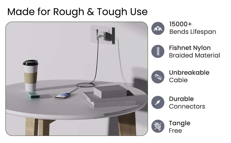 - Tough Fishnet Nylon Braided Cable: Made of special braided outer with rugged interior bindings, it is an ultra-durable cable that won’t be affected by daily rough usage with a 15000+ bends lifespan.