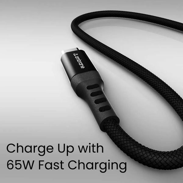 Ambrane ABCVS-12 is a fast-charging USB to Type-C cable that has an ideal length of 1.2 meters, is crafted in braided premium black colour and is durable and rugged in nature with 15000+ bends lifespan. It is specially crafted for VOOC, DART, DASH and Flash Charging enabled smartphones and is compatible with a wide range of devices that have a Type-C port. Charge your smartphones in the lowest possible time with up to 65W fast charging speed.