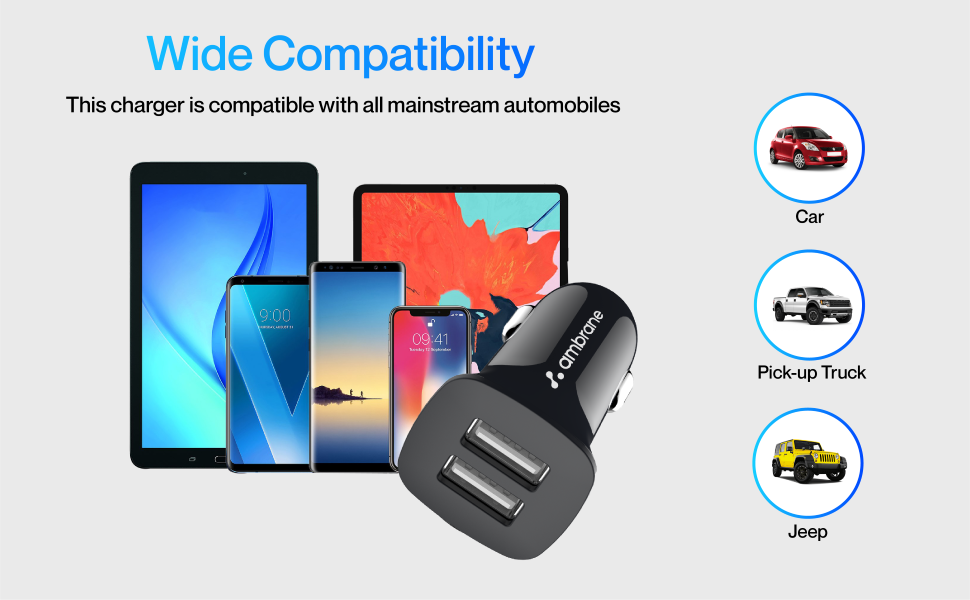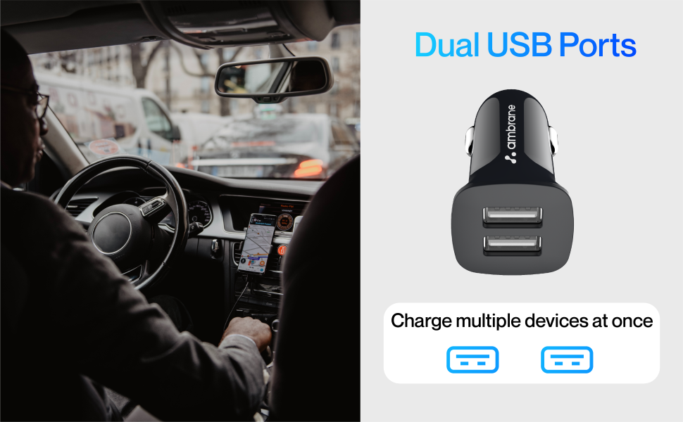 - Dual USB Output Ports: Two charging ports are provided to charge your USB-enabled devices. This car charger supports simultaneous charging from both ports.