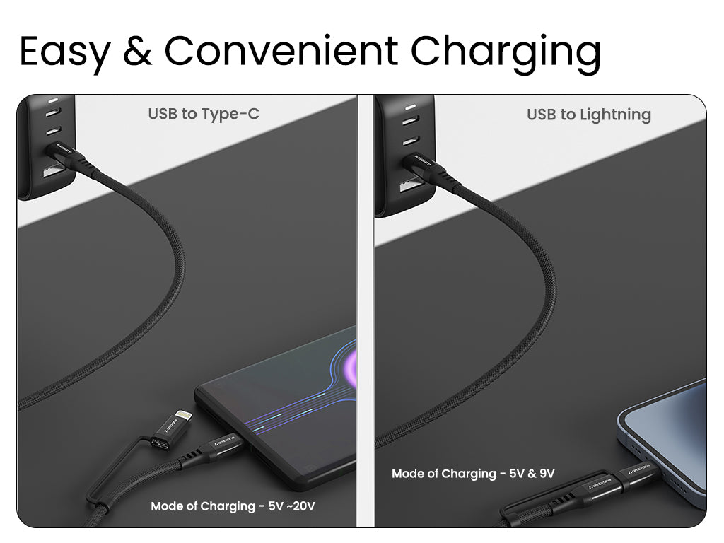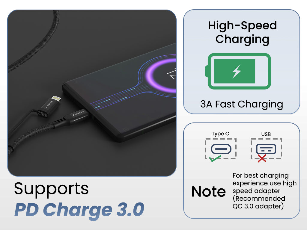 Ambrane ACDCS-12 is a 2-in-1 charging cable designed for quick and efficient charging of your devices. With a Type-C to Type-C connector, you can charge your Type-C laptops with ease and with Type-C to Lightning connector, charge your iOS devices with a fast charging speed of up to 20W. The cable is made with high-quality materials to ensure a long-lasting and durable charging solution.