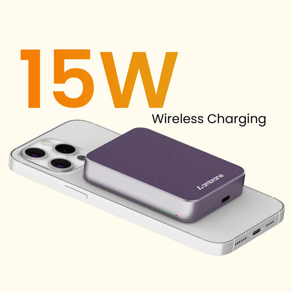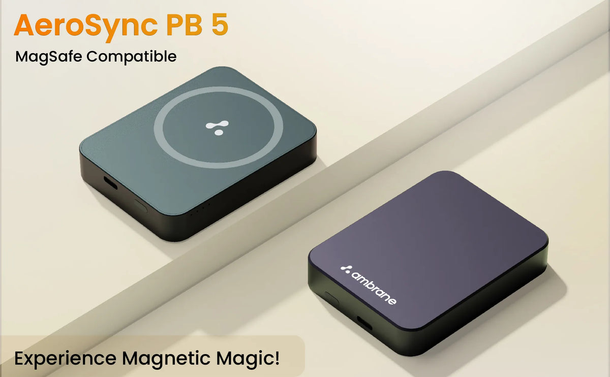 Discover the seamless fusion of technology and convenience with Ambrane's AeroSync PB-5, a magsafe power bank. Its 20W wired output & Type-C (PD 3.0) output port, positions it as the quintessential powerbank fast charging solution. Making it the perfect iphone power bank, but also assures a secure, wireless charging experience, elevating it to the top-tier of wireless powerbanks. Despite its mini power bank stature. Its premium metal build encapsulates durability and elegance, making it not just a pocket power bank but a style statement. For those pondering which power bank is the best or the best power bank to buy, the AeroSync PB-5 answers with its compact, yet robust design, ensuring it stands out as a small size compact powerbank that doesn't just charge but also complements your lifestyle. Whether you're in search of a portable charger power bank that slips easily into your pocket or a reliable companion for your iPhone, the AeroSync PB-5 is designed to meet your needs.