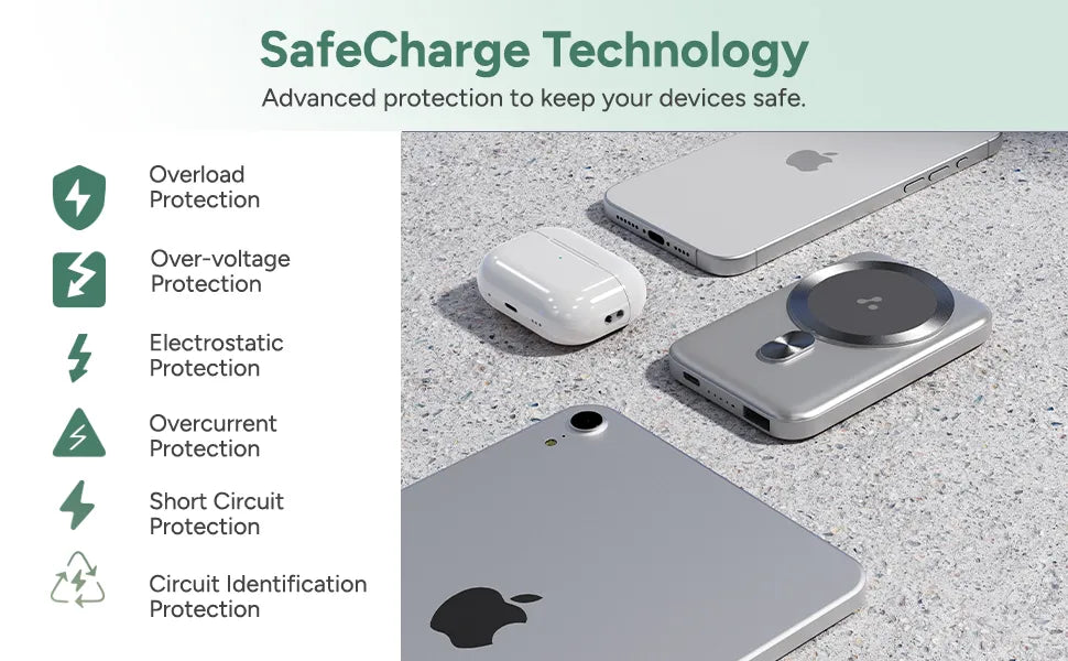 Advanced protection ensures your devices stay safe with overload, over-voltage, electrostatic, overcurrent, and short circuit safeguards. Circuit identification protection further enhances safety during charging.