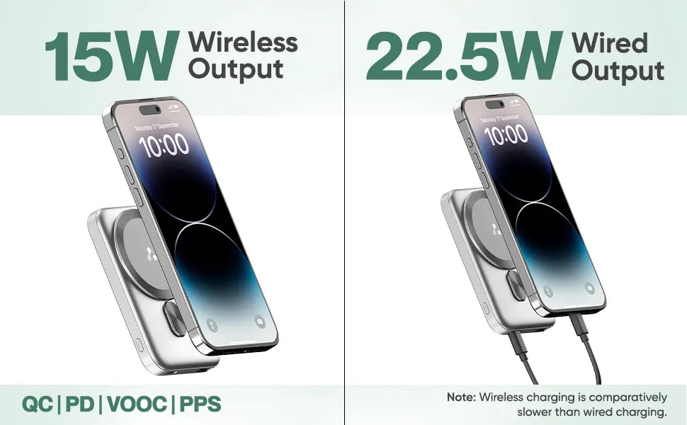 Enjoy rapid wireless charging with 15W output, powering your iPhone 15 to 25% in just 30 minutes. For even faster results, use the 22.5W wired output to reach 50% charge in the same time.