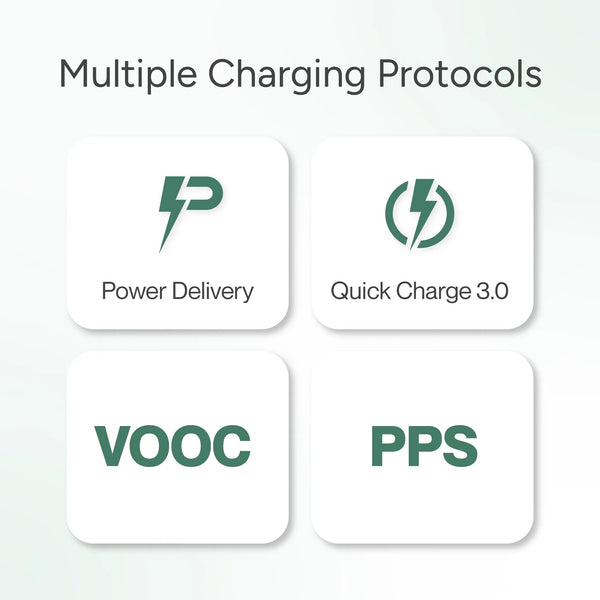 Supports various charging protocols for wide compatibility. Enjoy fast and efficient charging with Quick Charge 3.0, Power Delivery, VOOC, and PPS.