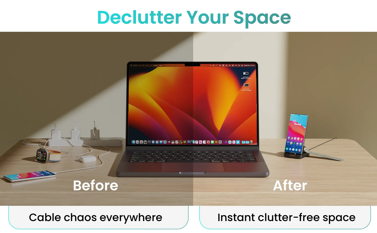 AeroSync Quad revolutionizes your space by eliminating cable chaos, instantly transforming it into an organized, clutter-free zone while providing the convenience of wireless charging and powerbank functionality.