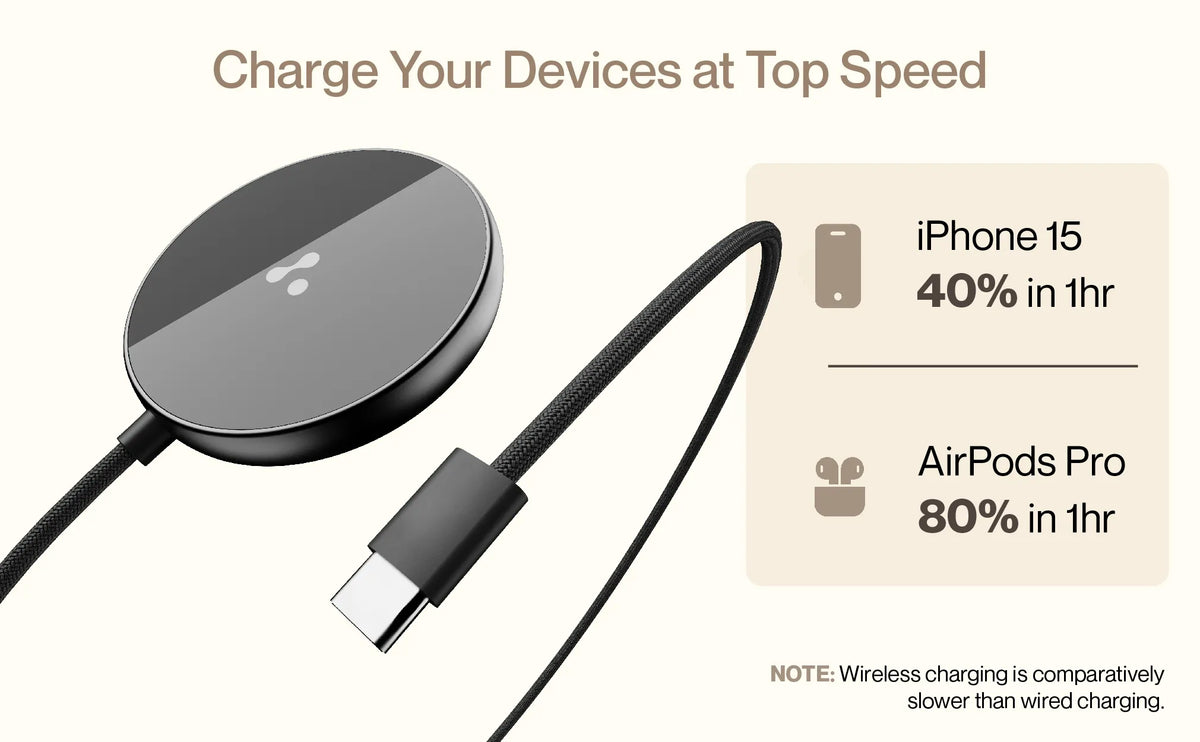 Charge your iPhone 15 to 40% in just 1 hour and your AirPods Pro to 80% in the same time with AeroSynQ. Please note that wireless charging is generally slower than wired charging, but AeroSynQ ensures efficient power delivery.