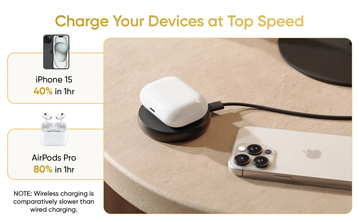 The AeroSynQ S2 can charge your iPhone 15 up to 40% in just one hour and your AirPods Pro up to 80% in the same time frame. Keep in mind that while wireless charging is convenient, it is generally slower than wired charging.