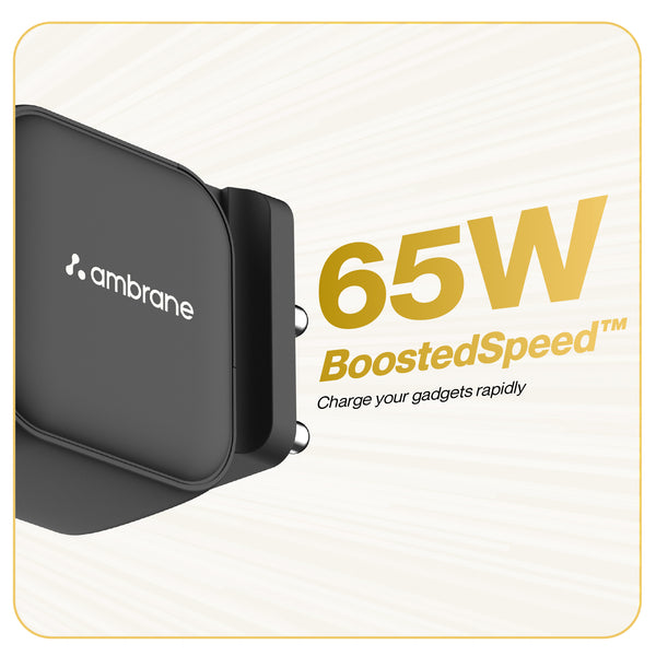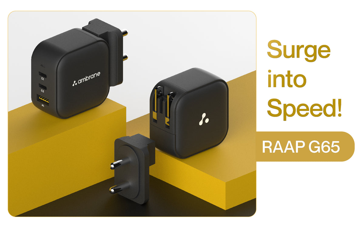 Introducing the Ambrane RAAP G65 - a powerful 65W Wall GaN Charger with GaNMAX technology. Charge your devices at blazing speeds with 3 ports (1 USB-A + 2 Type-C), laptop charging, and 12 layers of protection. BIS-certified, Made in India, and with a 180-day warranty. Experience charging at its finest!