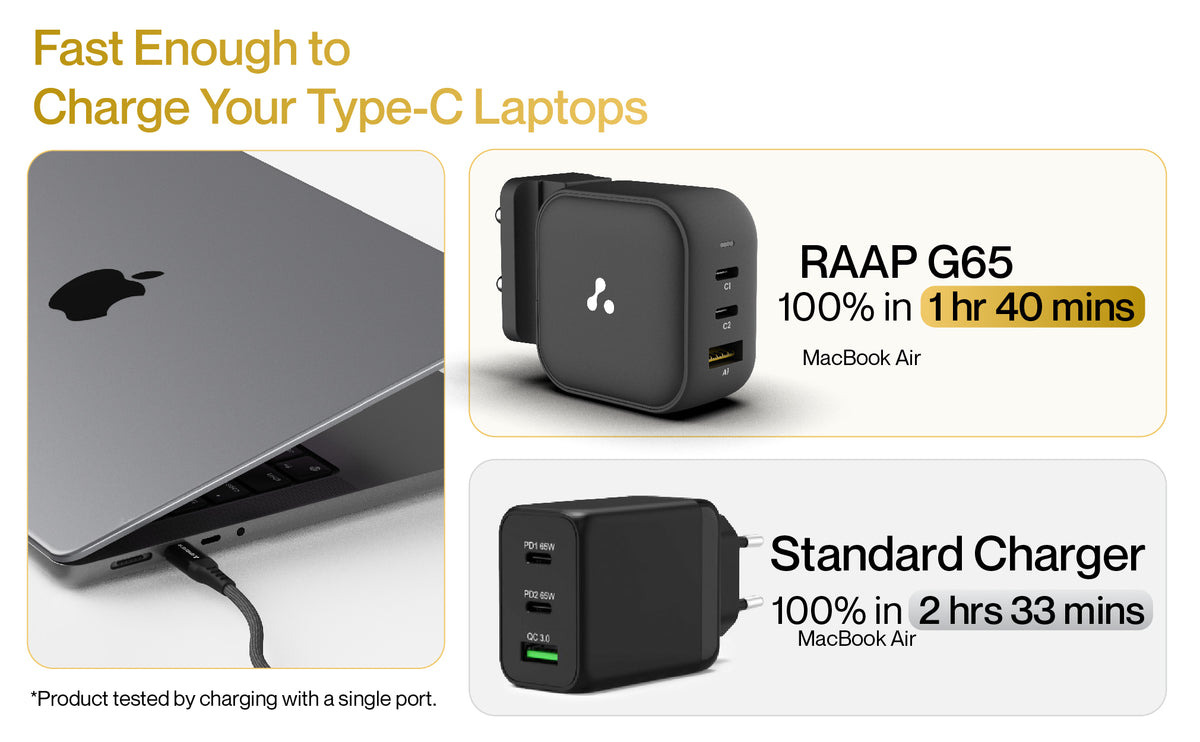 The RAAP G65 outperforms standard chargers, charging a MacBook Air in just 1 hour 40 minutes, ensuring your laptops are ready to use in record time
