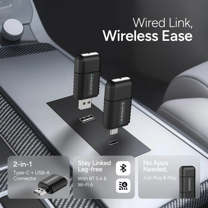Introducing the CarPlay 2-in-1 Wireless Dongle, your smart upgrade to a wire-free driving experience. This compact, plug-and-play device transforms your car's wired Android Auto or Apple CarPlay into a seamless wireless system. Simply plug into the USB-A or Type-C port, and you're ready to go. Equipped with the latest BT 5.4 and Wi-Fi 6 for faster pairing and stable connectivity. Lightweight, compact, and easy to carry, it syncs smoothly with your car’s controls while ensuring minimal lag.