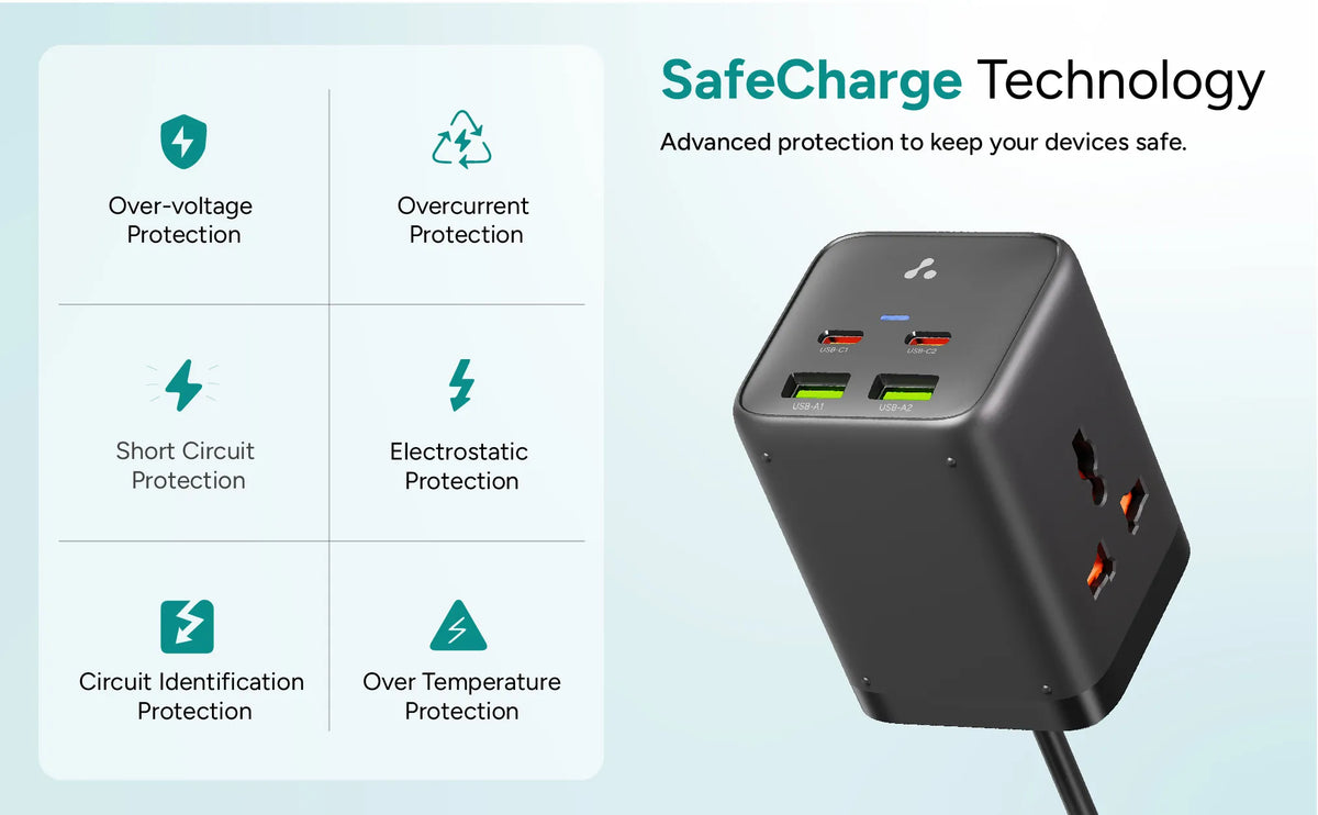Safecharge Technology ensures your devices are protected from overcharging, overheating, and overcurrent. It automatically adjusts power distribution, providing a safe, efficient charging experience.