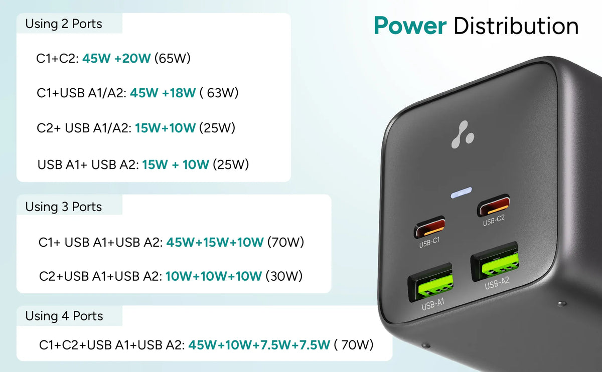 Power Distribution ensures that energy is efficiently delivered to multiple devices simultaneously, optimizing charging speed and performance. It intelligently balances the power output based on the connected devices, preventing overload and ensuring safe, consistent charging.