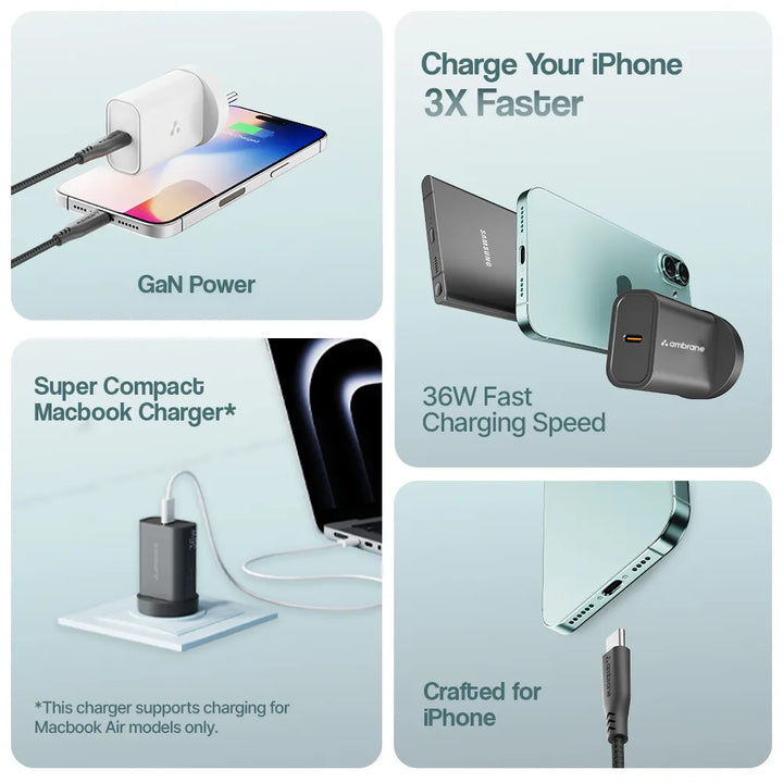 Charge your devices two times faster with the 36W Fast Charger. Experience quick and efficient charging for a wide range of devices, from iPhone and macbook, to android gadgets. Featuring a single Type-C port, it delivers powerful performance in a compact and lightweight form, making it ideal for travel and everyday use. Built with advanced GaN technology, it offers safer, faster, and more efficient charging.