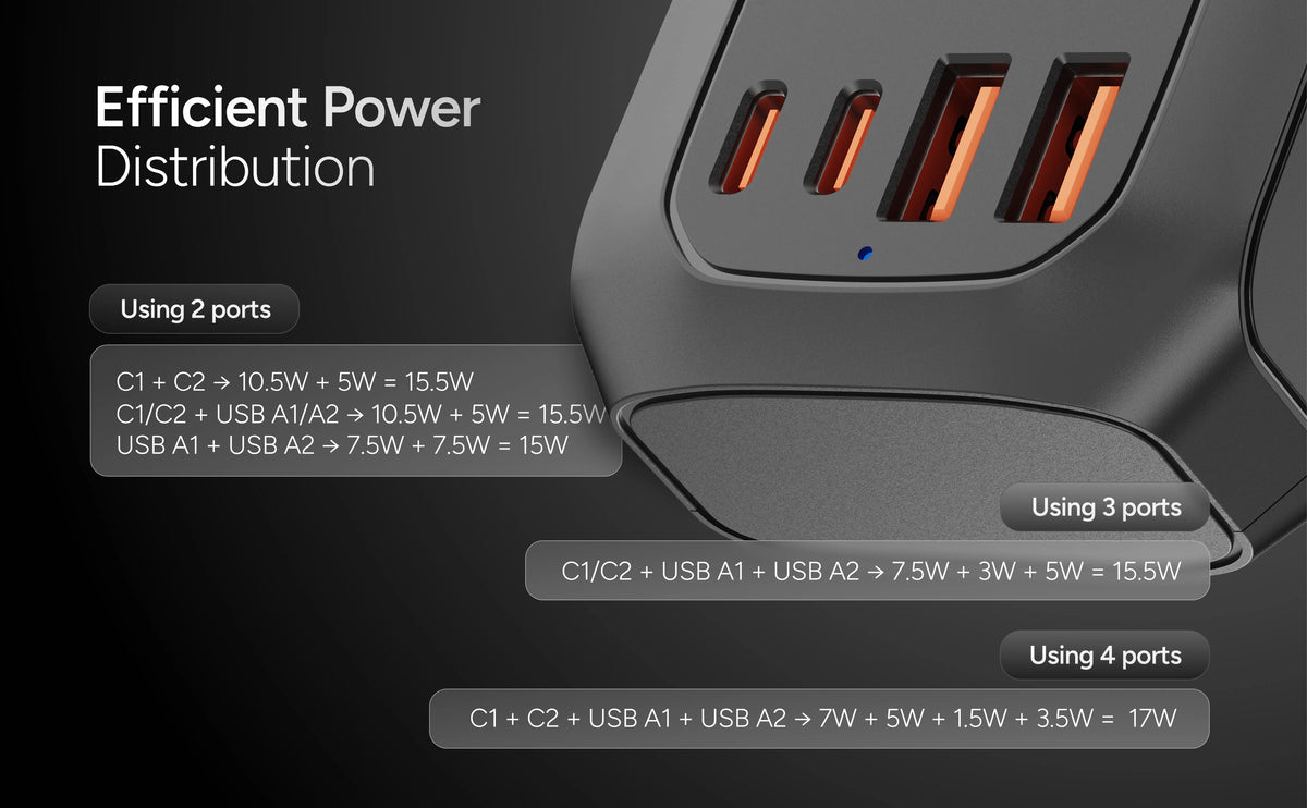 The Charge X20 features advanced power distribution that ensures your devices charge efficiently, regardless of how many are connected. It balances power across all five ports for optimal performance, so you're never left waiting.