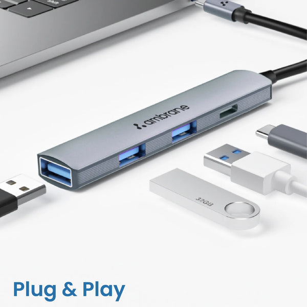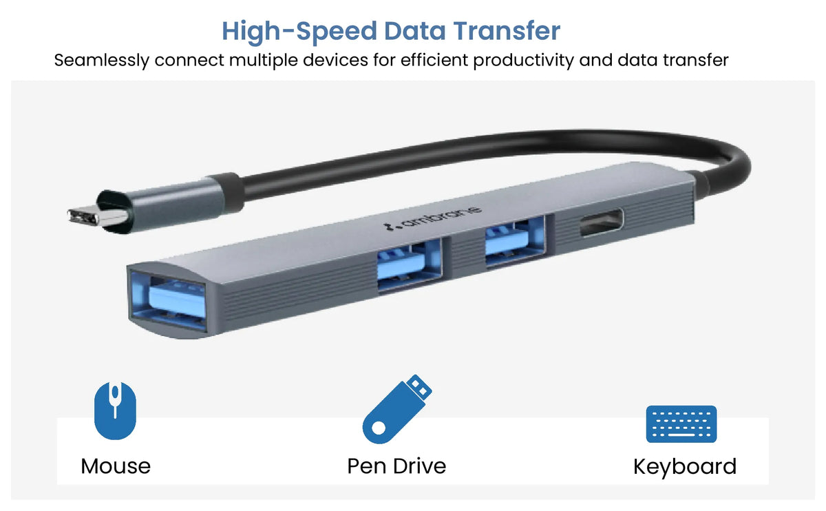 Meet E-Hub+, the ultimate 4-in-1 Multiport USB Hub! Featuring lightning-fast data transfer speeds up to 5 Gbps, inclusive of 3 USB-A ports, 1 Type-C port, and Type-C OTG support. This sleek hub assures effortless connectivity, compatibility across multiple devices, and a dependable 365-day warranty for uninterrupted on-the-go performance!