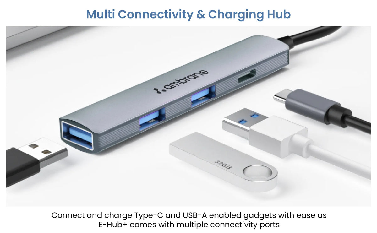 Simplify your tech setup with E-Hub+'s multi-connectivity hub, effortlessly linking and powering Type-C and USB-A enabled gadgets through its multiple ports.