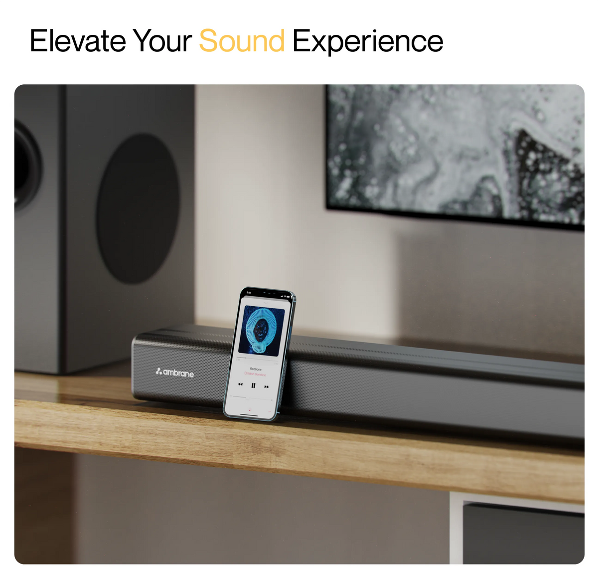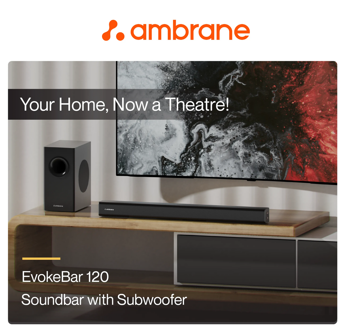 Discover a whole new level of cinematic audio experience at home with the Ambrane EvokeBar 120 soundbar. Immerse yourself and groove to every beat with a 60W subwoofer! Watch your favourite movies in crystal clear quality with Cinematic 2.1 Surround Sound. Take your theatre experience to the next level with multiple EQ Modes and smart touch controls. Stay connected with various connectivity options ranging from AUX, HDMI (ARC), Optical, USB to Bluetooth V5.0. So, just sit back and control everything with a remote controller. It's time to invite the cinema to your home