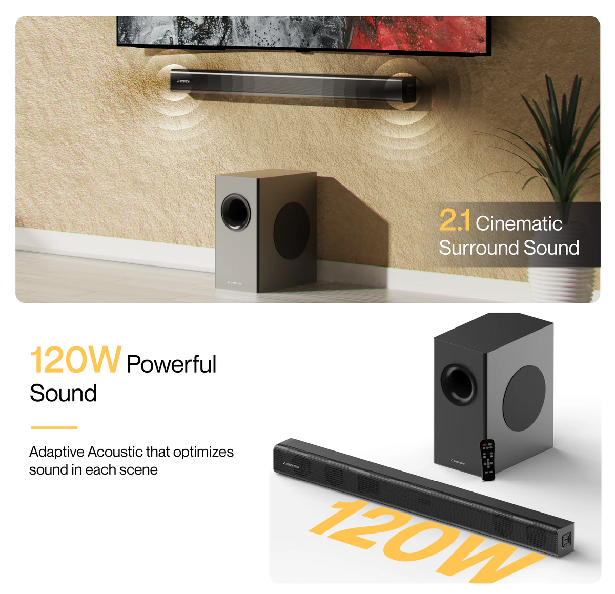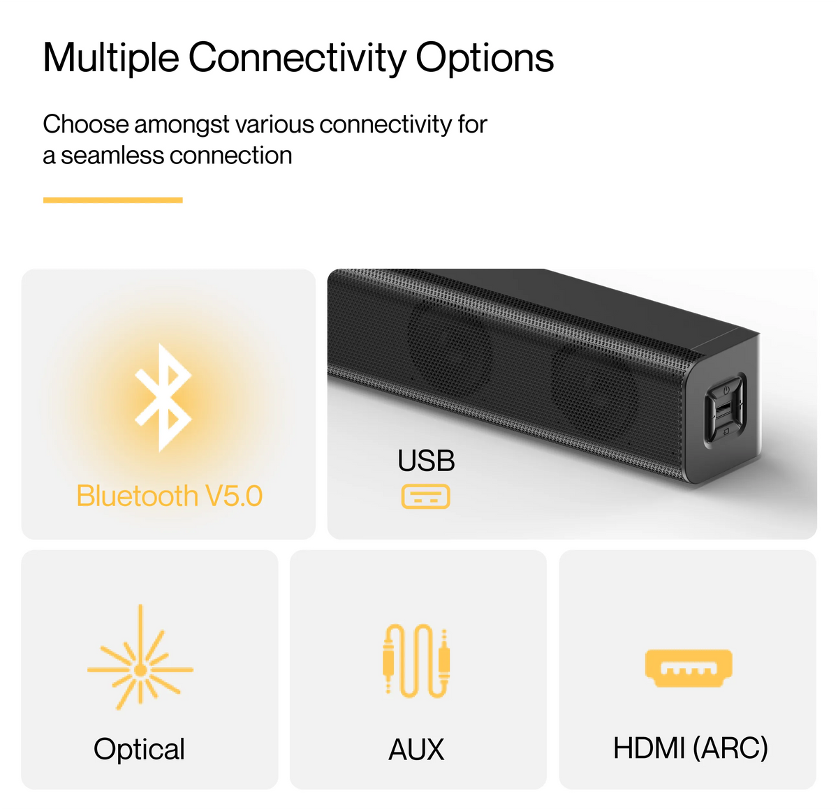- Multiple Connectivity Options: Access all your devices via both wireless and wired forms of connectivity, such as Bluetooth V5.0, AUX, USB, Optical and HDMI (ARC) with the versatile Evoke Bar 120.