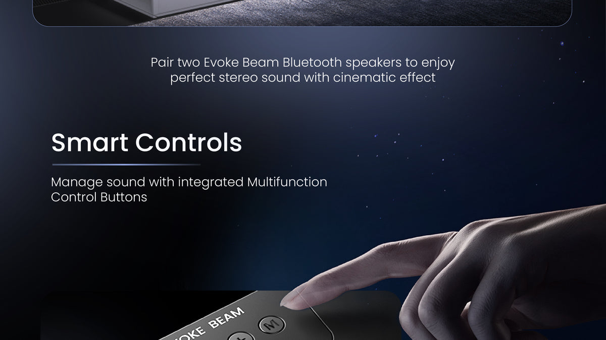- Twin Pairing: Pair 2 Evoke Beam speakers at a time for an enhanced stereo sound experience that will take your music to the next level.