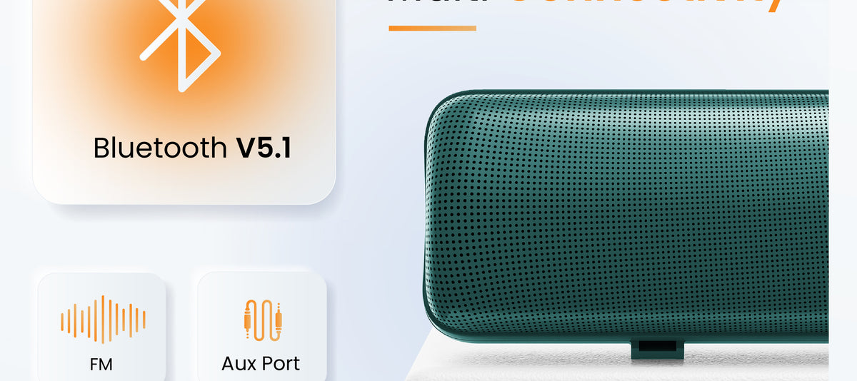 - Universal Connectivity: With Bluetooth version 5.1 and a range of up to 10 meters, you can connect your device wirelessly, or use the TF Card, AUX port, USB port, or FM to connect.