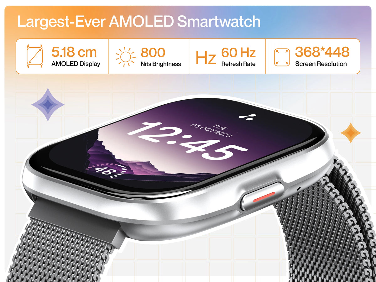 - Screen & Looks: 2.04-inch AMOLED Display, 368*448 screen resolution, 800 Nits Brightness, 60Hz refresh rate, 2.5D Curved Glass, Comfortable adjustable Straps, High-quality frame & IP67 water resistant