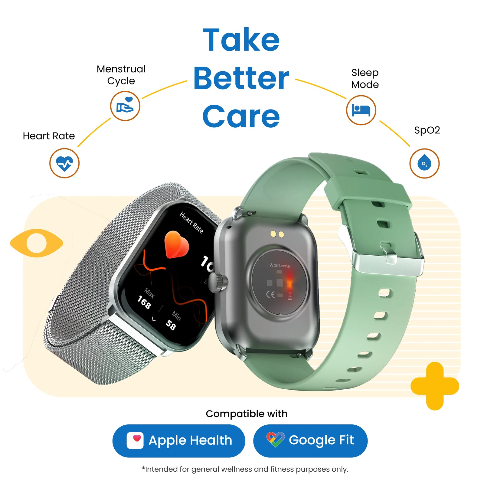 - Wellbeing Monitoring: Monitor SpO2, heart rate, sleep, breath training, and stress levels in real-time with the Ambrane Glaze+ smartwatch.