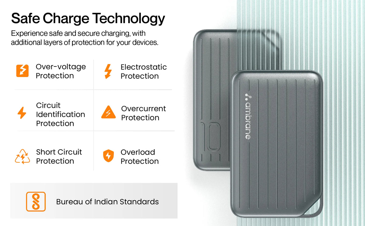Experience safe and secure charging, with additional layers of protection for your devices. The Line 10 ensures peace of mind with comprehensive safety measures, including Overload, Over-voltage, Electrostatic, Overcurrent, Short Circuit, and Circuit Identification Protection, and is BIS Certified.