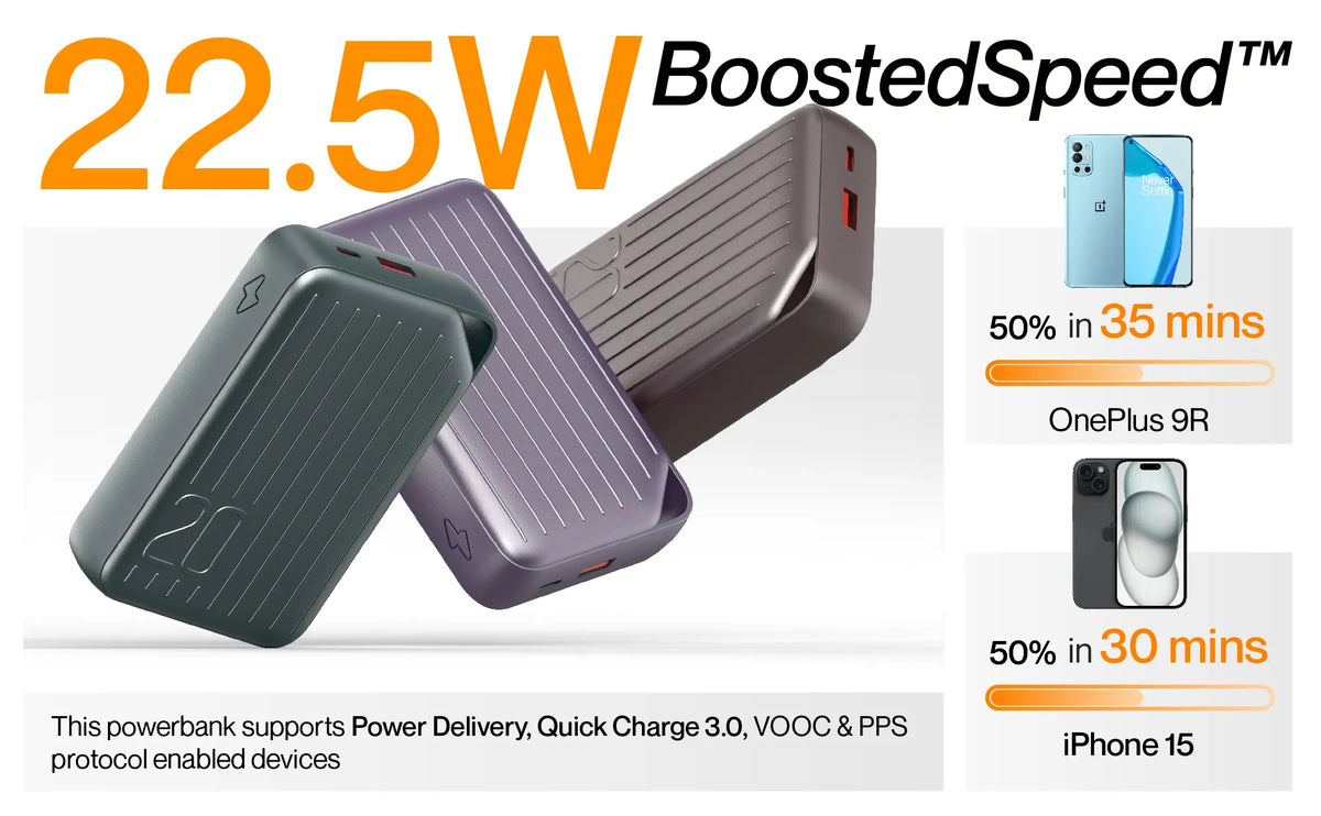 Fast Charge iPhone 15 (50% in 30 mins): Charge your iPhone 15 to 50% in just 30 minutes with the Line 20. Enjoy the convenience of fast charging for your OnePlus 9R, reaching 50% in only 35 minutes.
