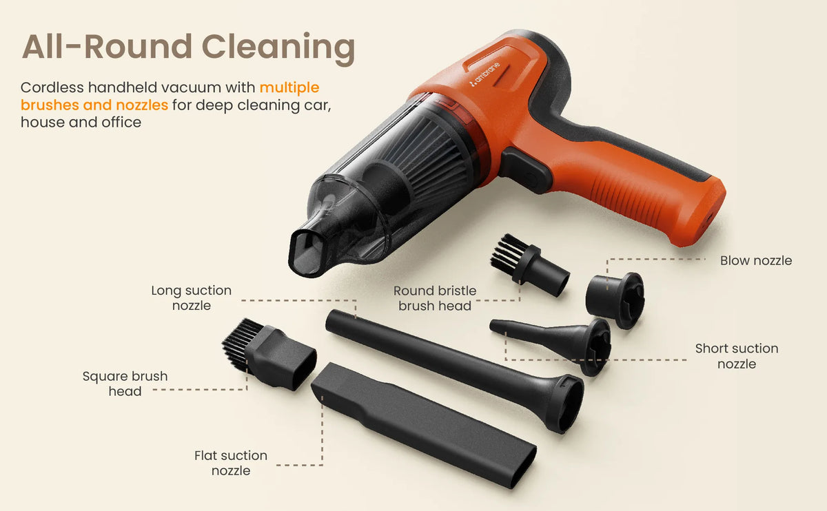 The MiniVac-02 is a cordless handheld vacuum equipped with multiple brushes and nozzles for deep cleaning in your car, house, and office. It includes a square brush head, round bristle brush head, short suction nozzle, long suction nozzle, flat suction nozzle, and a blow nozzle for versatile cleaning needs.