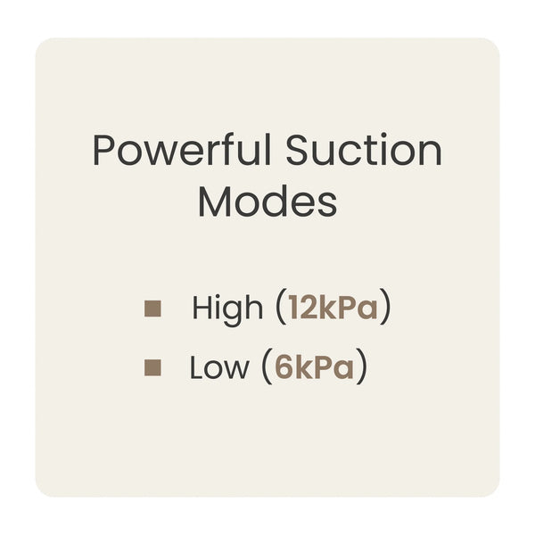 - Two Suction Levels: Offers High (12Kpa) and Low (6Kpa) suction modes to handle different cleaning needs.