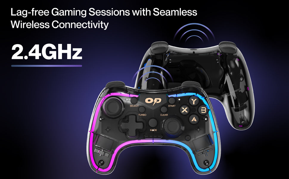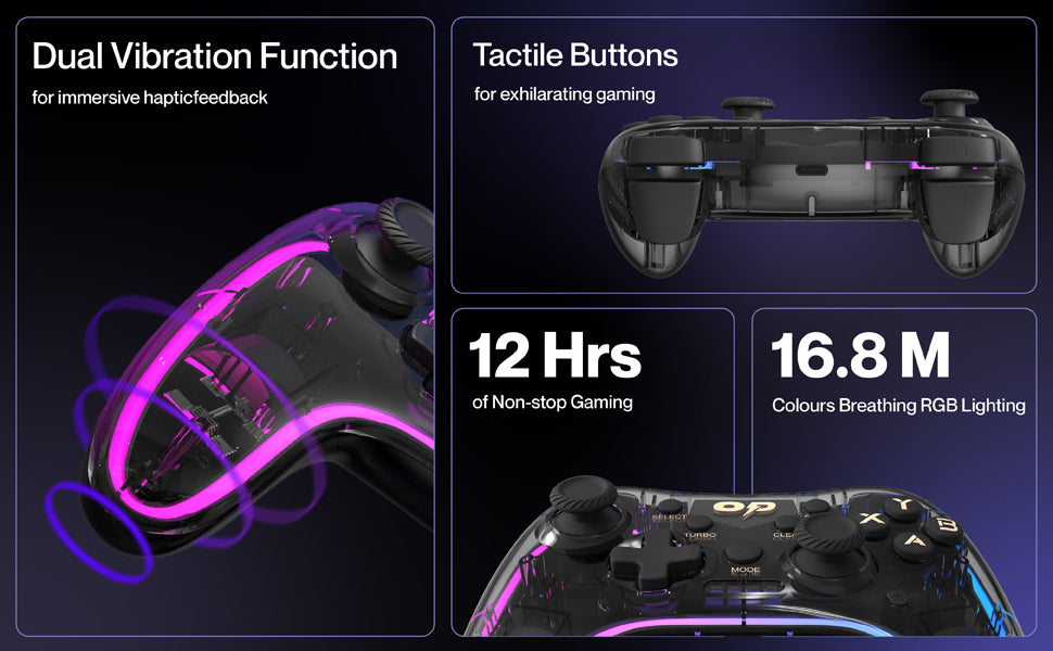 Get the ultimate gaming experience with the OverPowered OP-WLGC01 wireless gaming controller. With 2.4GHz wireless connectivity, turbo mode, dual vibration function, and an easy-to-hold design, this controller lets you play your favourite games without cords. It has Type-C charging, a USB receiver, and an 800mAh inbuilt battery that lasts up to 12 hours. The controller supports PC X-Input & D-Input mode and works with PS3 console, Windows system, Android TV set/media box, and Nintendo Switch.