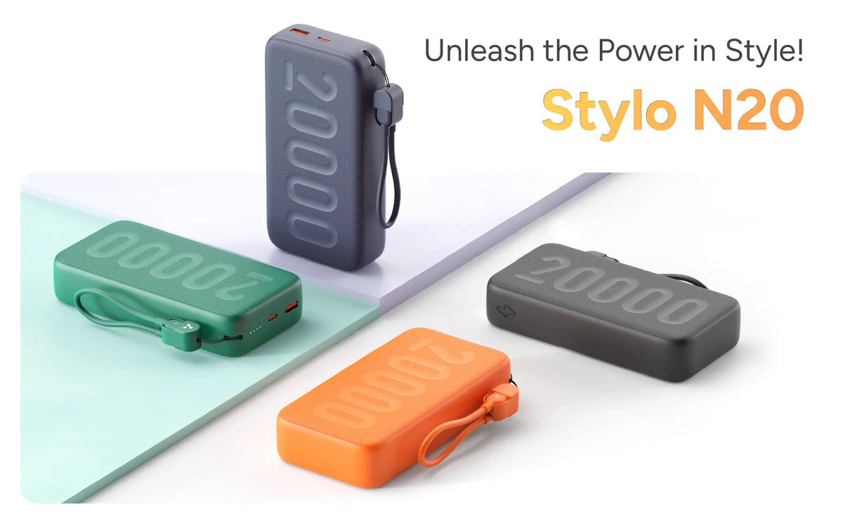 Experience mega power with the one and only portable Stylo N20. Charge up your devices on the go with ease and efficiency. Boasting a 20000 mAh capacity, this powerbank is designed to provide continuous power with multiple charges. The Stylo N20 features a convenient Type-C to Type-C cable loop holder for easy access to your charging cable, everywhere you go. Keep all your devices running via additional Type-C and USB-A ports, with 22.5W BoostedSpeed™. Choose safety and efficiency with multiple protocol support, including PD 3.0, QC 3.0, PPS, and VOOC. Stylish and compact, you can flaunt its durable ABS textured build everywhere.