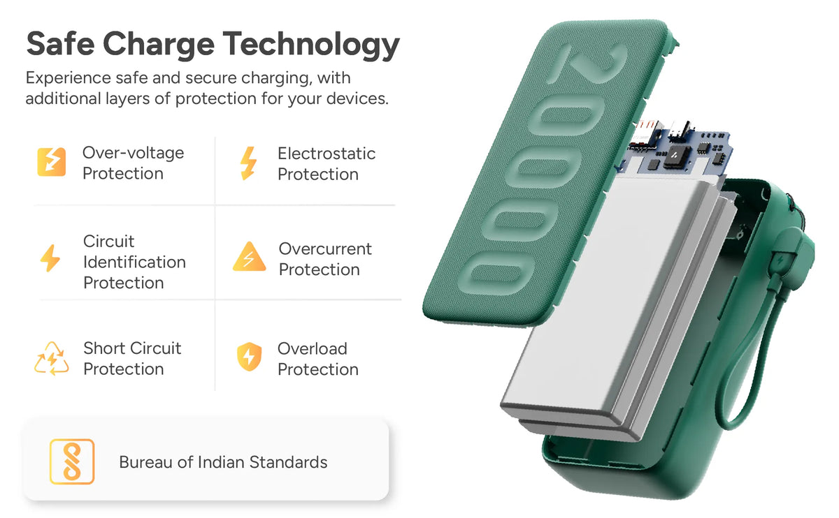 Charge your high maintenance devices with a peace of mind. Stylo N20 assures safe and secure charging with overheating control, overvoltage protection, and short circuit prevention, for a seamless and safe charging experience.
