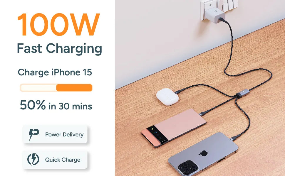 Charge up to 50% in 30 minutes with 100W power, ideal for Power Delivery and Quick Charge devices.